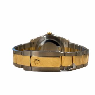 Gehäuse aus Edelstahl & 18K Gelbgold, Ø 29,0 mm, weisses Zifferblatt mit schwarzen römischen Ziffern, innenseitig entspiegeltes Saphirglas, Gliederarmband mit Faltschliesse aus Bicolor-Edelstahl, Schweizer Quarzwerk, wasserdicht bis 5 bar.