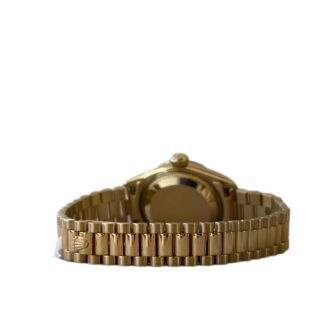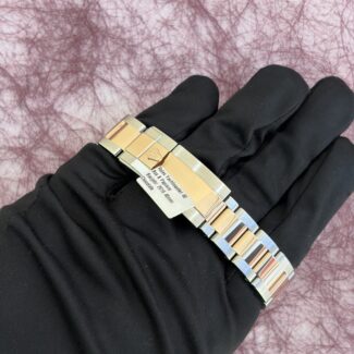 Gehäuse aus Edelstahl & 18K Gelbgold, Ø 29,0 mm, Perlmuttzifferblatt mit 8 Diamanten (0,052 ct.) und applizierten Indizes, innenseitig entspiegeltes Saphirglas, Gliederarmband mit Faltschliesse aus Bicolor-Edelstahl, Schweizer Quarzwerk, wasserdicht bis 5 bar.