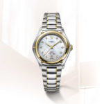 EBEL 1911 Damenuhr, Gehäuse aus Edelstahl und 18K Gelbgold, Ø 30 mm, weißes Perlmuttzifferblatt mit 10 Diamanten (0.052ct.), Datumsfenster auf 6:00 Uhr, innenseitig entspiegeltes Saphirglas, Gliederarmband aus Bicolor-Edelstahl, Faltschließe, Schweizer Quarzwerk, wasserdicht bis 10 bar