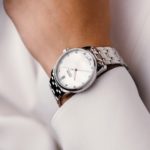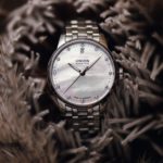 Mit seinem 33 mm Durchmesser macht das Edelstahlgehäuse der Seris Datum am weiblichen Handgelenk immer eine gute Figur. Längliche, schlanke Anstöße sorgen zusätzlich dafür, dass sich das Armband bequem an das Handgelenk anschmiegt. Die für die Seris typischen skelettierten und floralen Zeiger lassen sich formschön unter dem gewöblten Saphirglas erkennen und runden das weiße Perlmuttzifferblatt elegant ab. Einen besonders edlen Look erzeugen 12 Diamanten als Indizes. Die schlichte Gestaltung der Uhr hebt sich durch ein prominent positioniertes Datum bei 12 Uhr ab. Damit die Trägerin sich individuell ausdrücken kann – ob nun passend zur Persönlichkeit oder zum jeweiligen Anlass – wird die Uhr neben dem Edelstahlband mit jeweils zwei weiteren Wechselbändern geliefert: einem weißen Lederband sowie einem grauen Satinband. Ausgestattet ist der edle Zeitmesser mit der neuesten Werkstechnik, dem UNG-07.S1, welches durch die Siliziumspirale robust gegen jedwede Alltagsmagnetfelder geschützt ist und zudem eine Gangreserve von 60 Stunden aufweist.